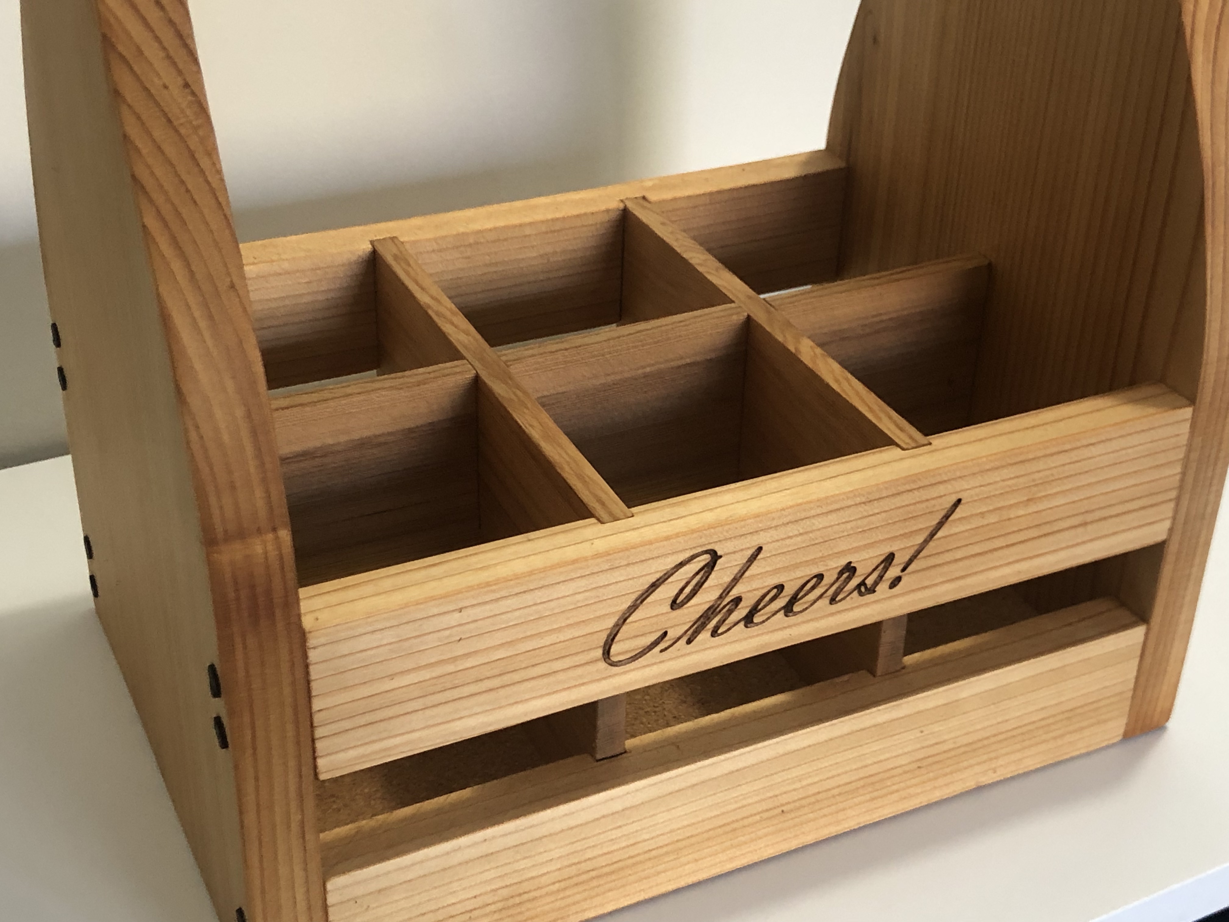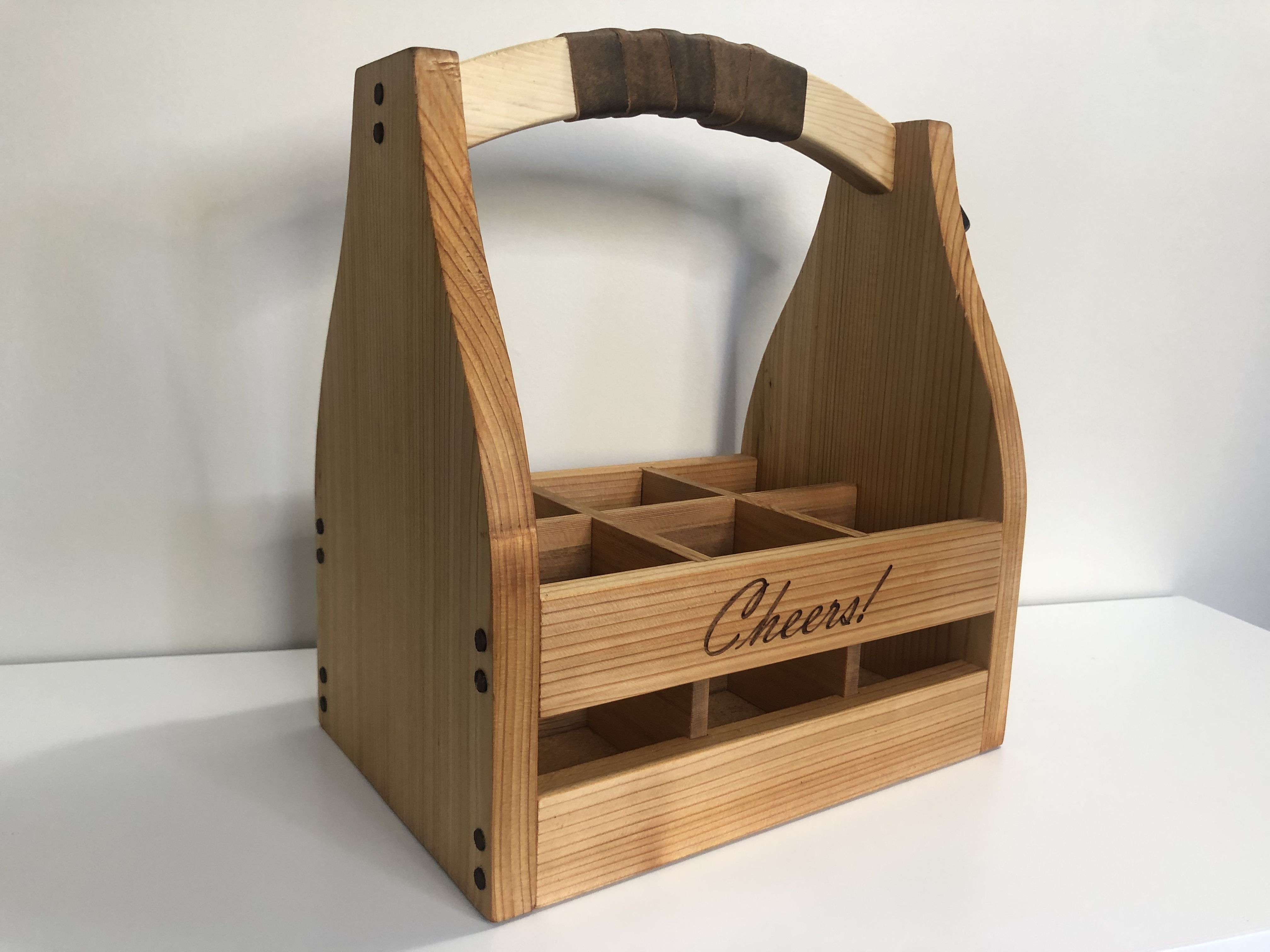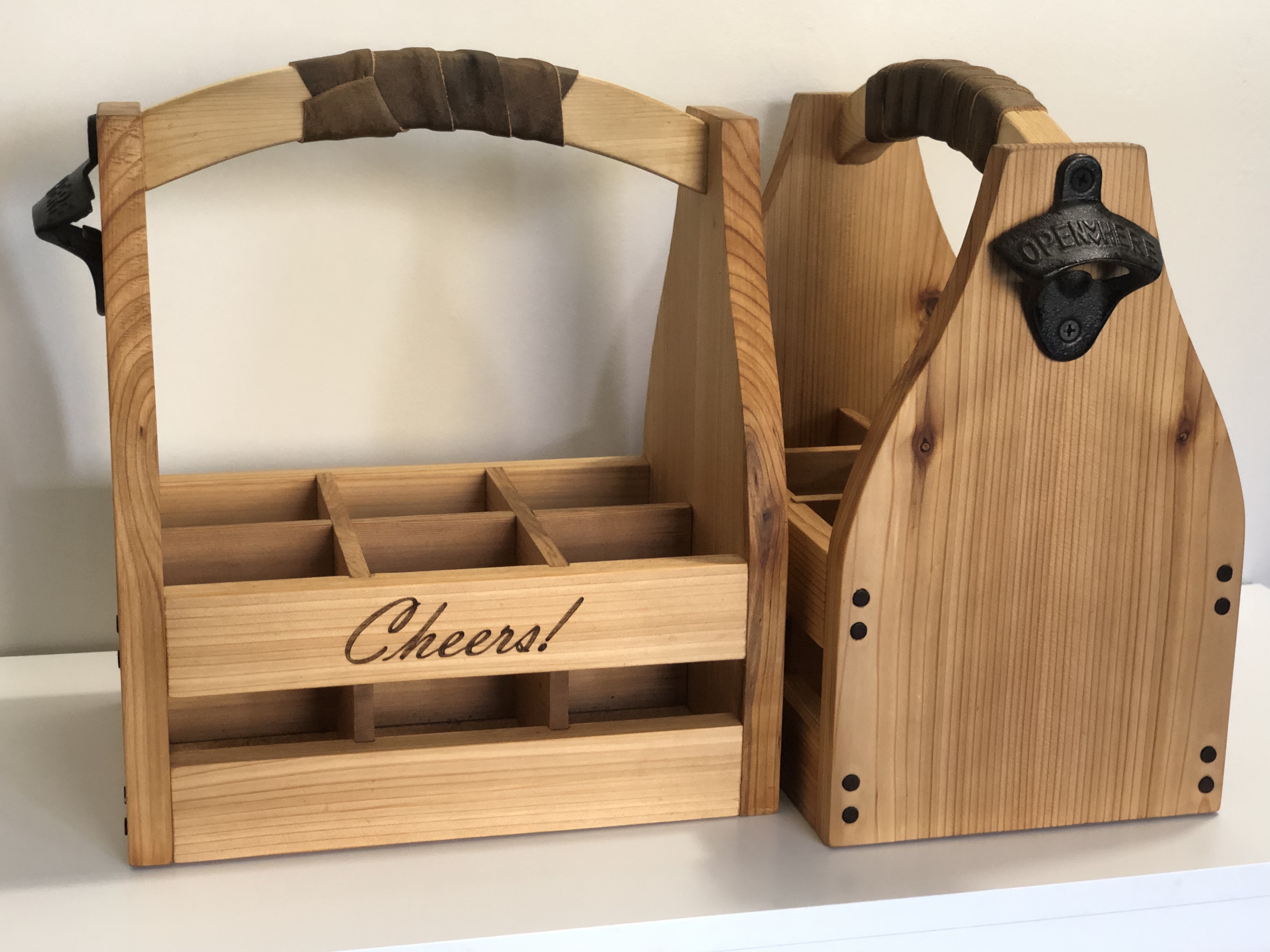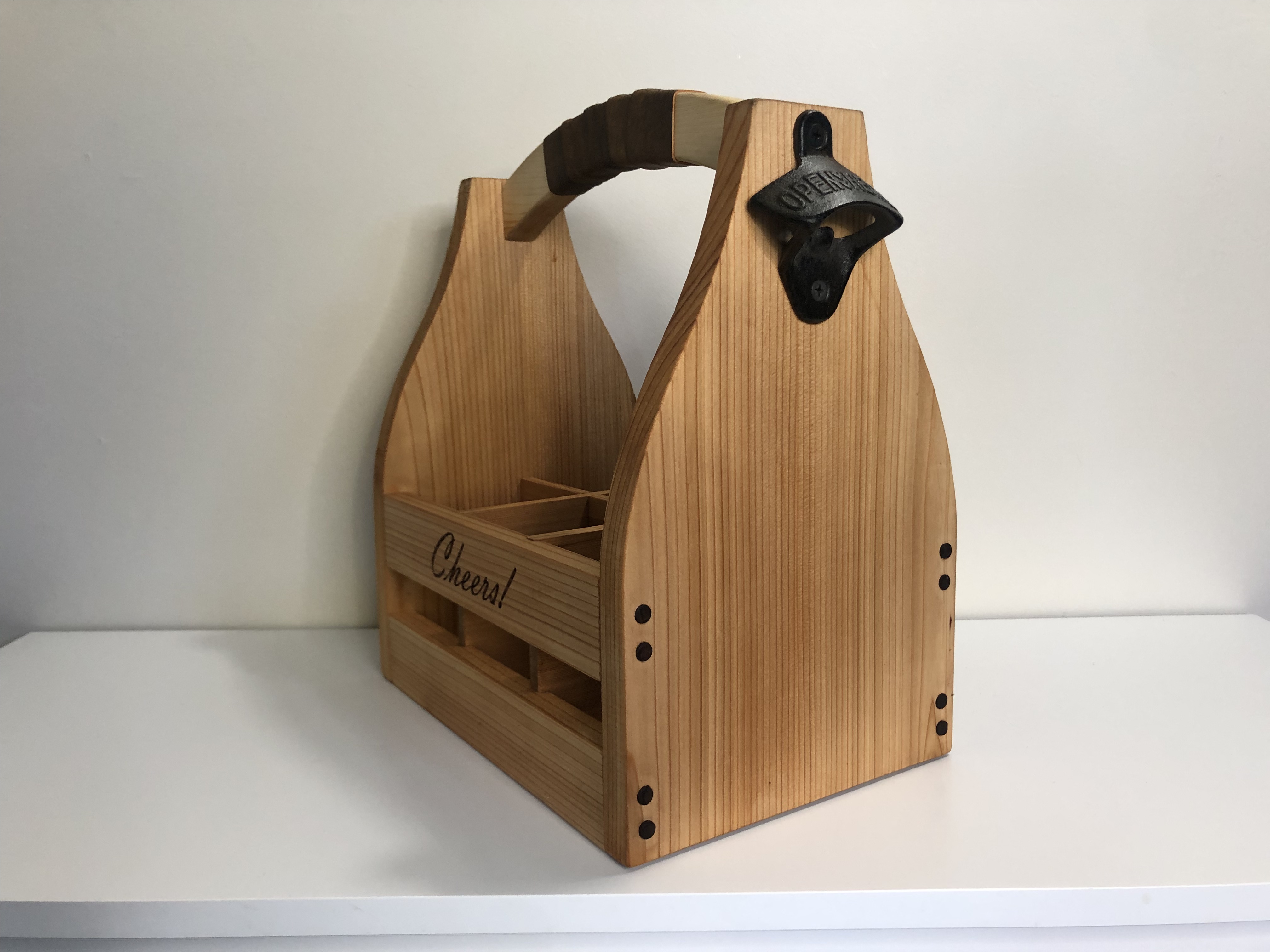 Wooden beer caddy with custom engraving, leather handle and bottle opener.